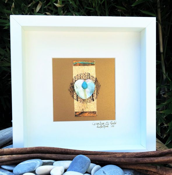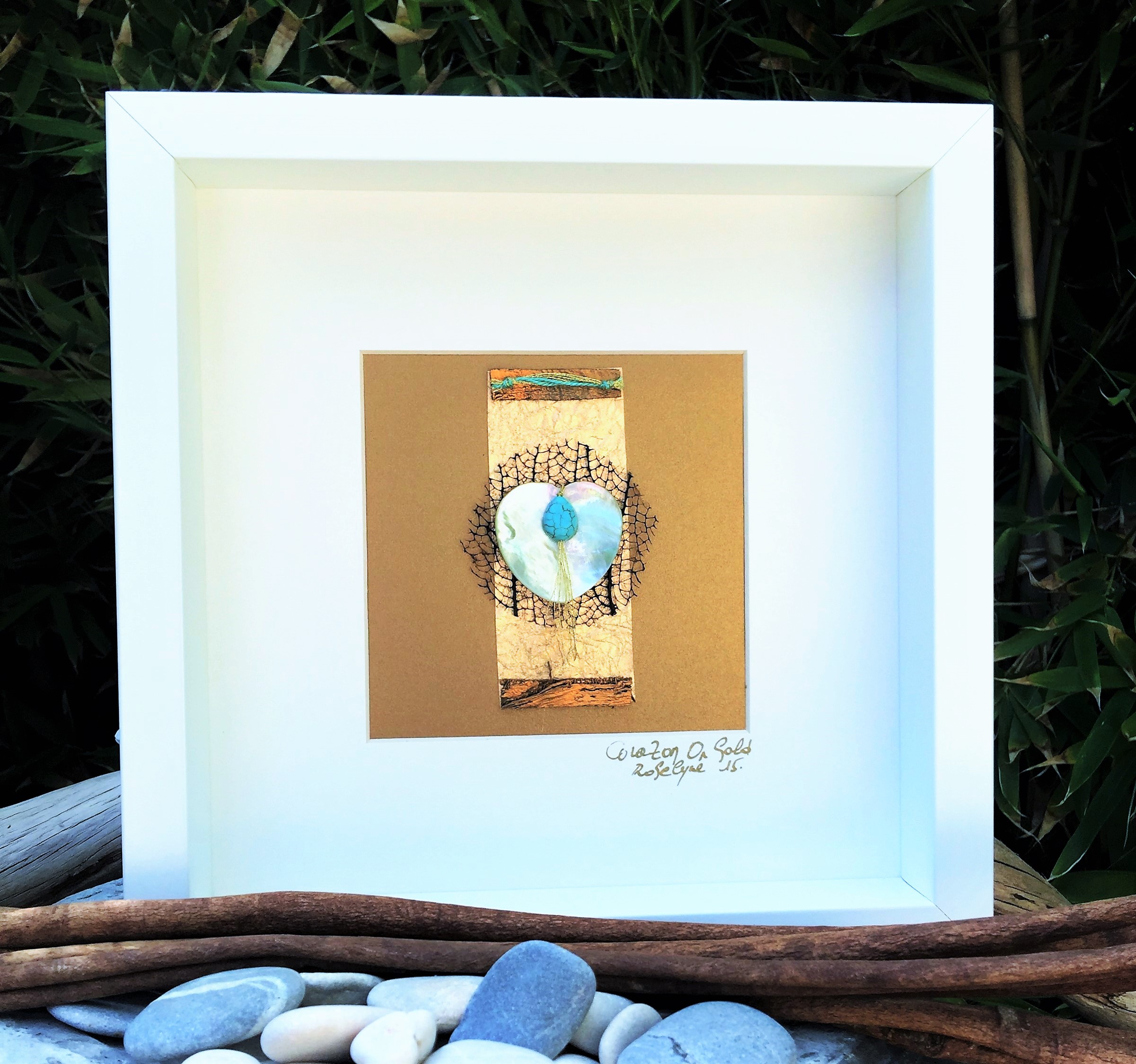 Un disque de gorgone de République Dominicaine accueille un cœur de nacre de Key Largo -Floride USA-, et une turquoise issue d’un bijou indonésien, qui rejette des fils dorés.