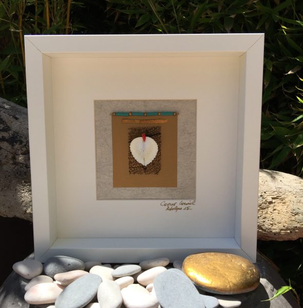 Un morceau de gorgone ramassé sur un rivage de République Dominicaine reçoit un coquillage bivalve «Bucarde-cœur de Vénus » acheté à Key Largo en Floride. Un petit corail rouge de Corse se loge sur le haut des deux valves.
