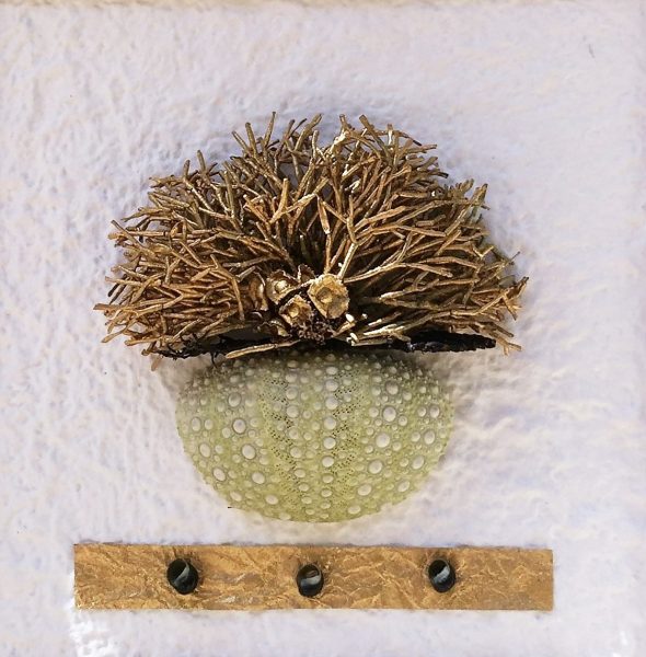 Oursin taillé à 1/3 recevant des algues dorées et une couronne en gorgone noire. Tout ces éléments ont été trouvés sur différents rivages sauvages de République dominicaine, jusqu’à la frontière haïtienne