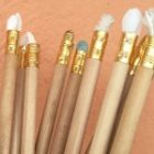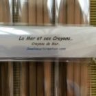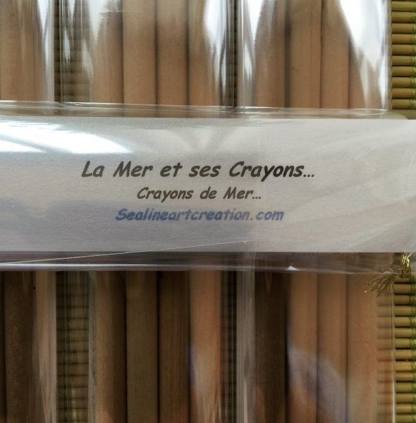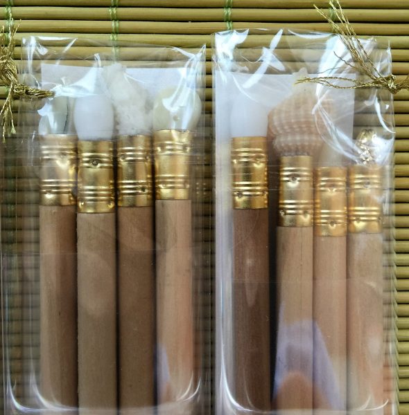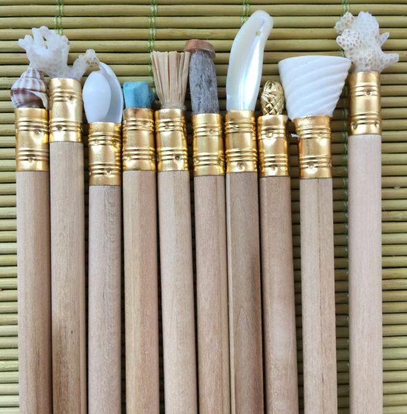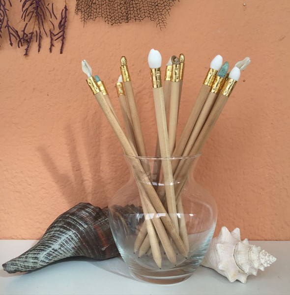 Natural wood graphite pencils crowned by a sea themed element…mother of pearl subject, shells, small pieces of drift wood, white coral piece or small jewel representing a sea subject…