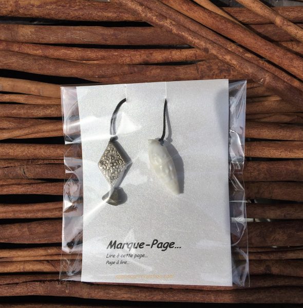 Les marque-pages sont toujours constitués d’au moins deux éléments dont l’un d’entre eux est d’origine marine… coquillage, pastille de nacre, morceau de nacre etc…et d’un second sujet, bijou, perle etc..
