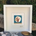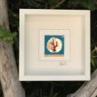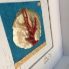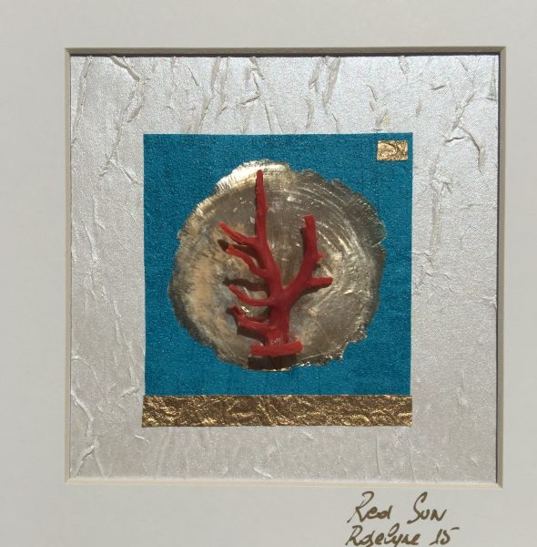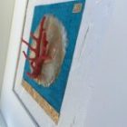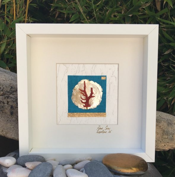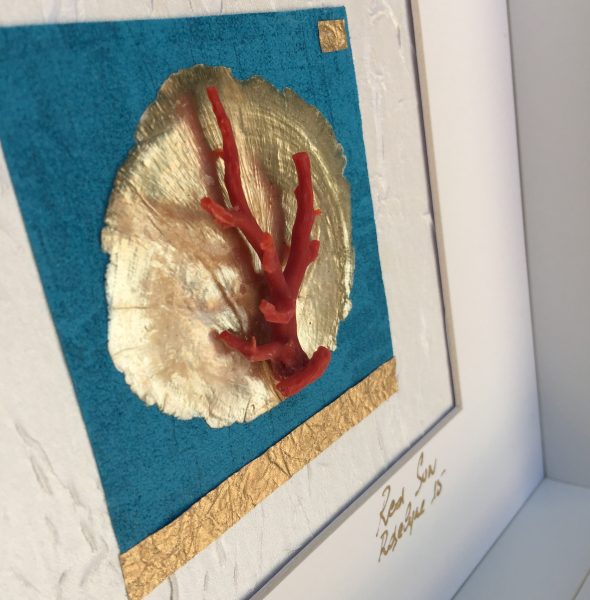 Sur fond de papier satiné et froissé blanc, un second papier bleu outre-mer reçoit une pastille de fine nacre or. Une branche de corail rouge péché vers Djerba, Tunisie vient se poser comme un arbre.