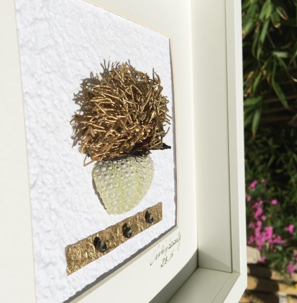 Oursin taillé à 1/3 recevant des algues dorées et une couronne en gorgone noire. Tout ces éléments ont été trouvés sur différents rivages sauvages de République dominicaine, jusqu’à la frontière haïtienne