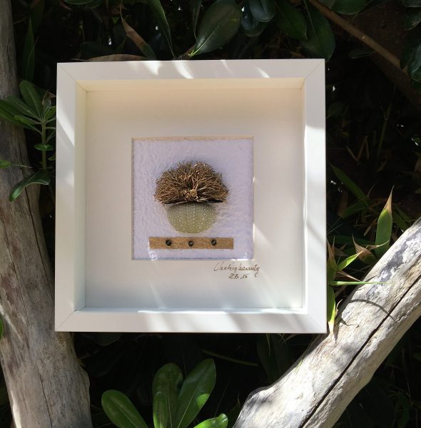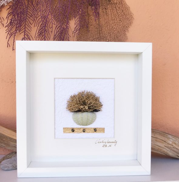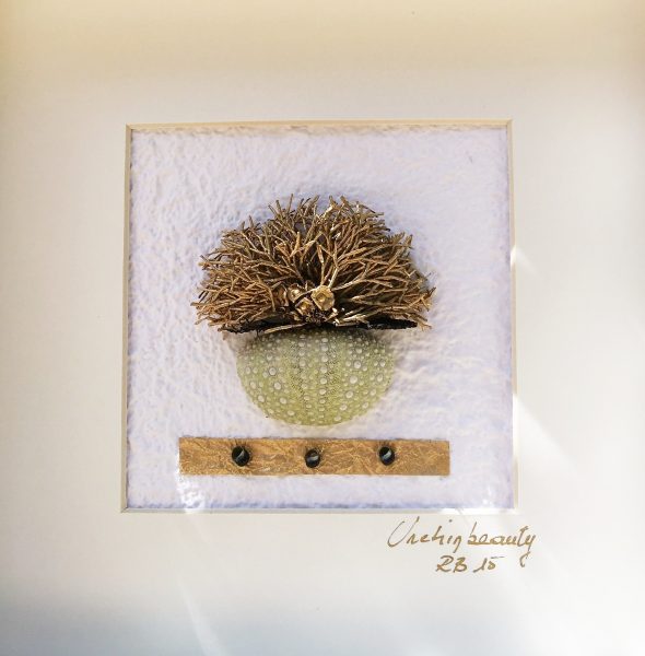 Océans, vents et marées… La nature est intemporelle, tous les rejets des fonds marins, végétal, animal, mélangés à la flore d’un rivage sont pour Roselyne Begtine motif à création.